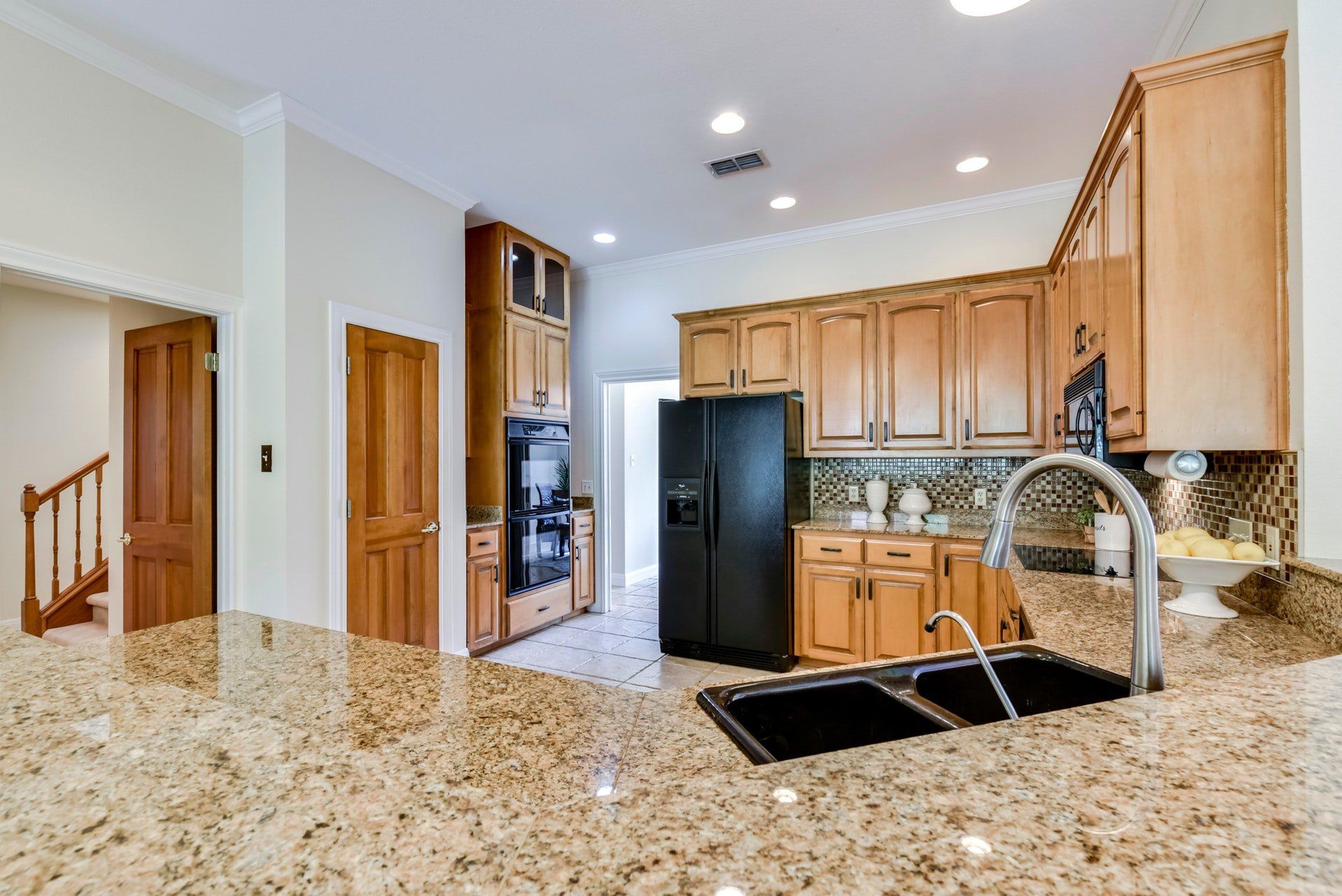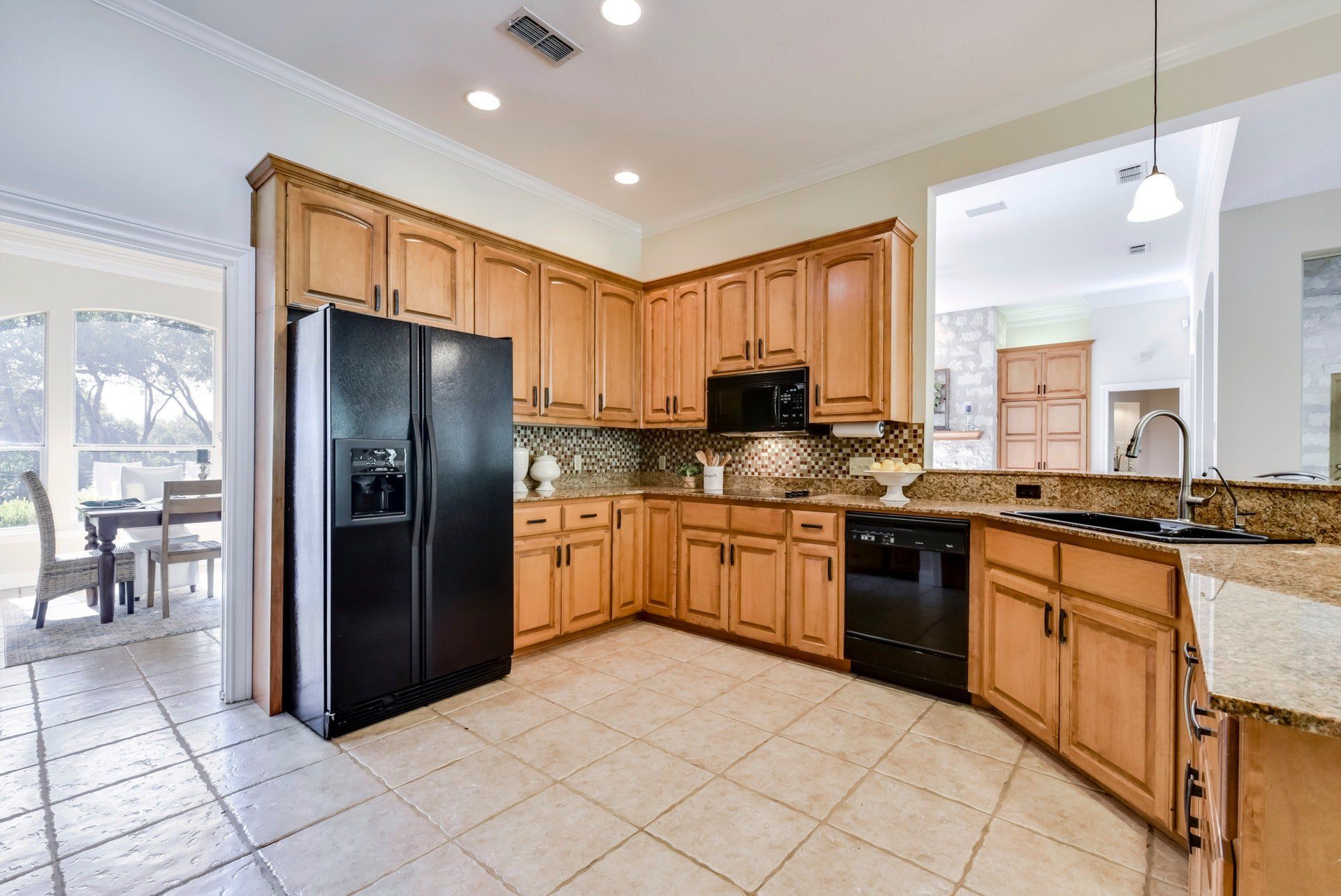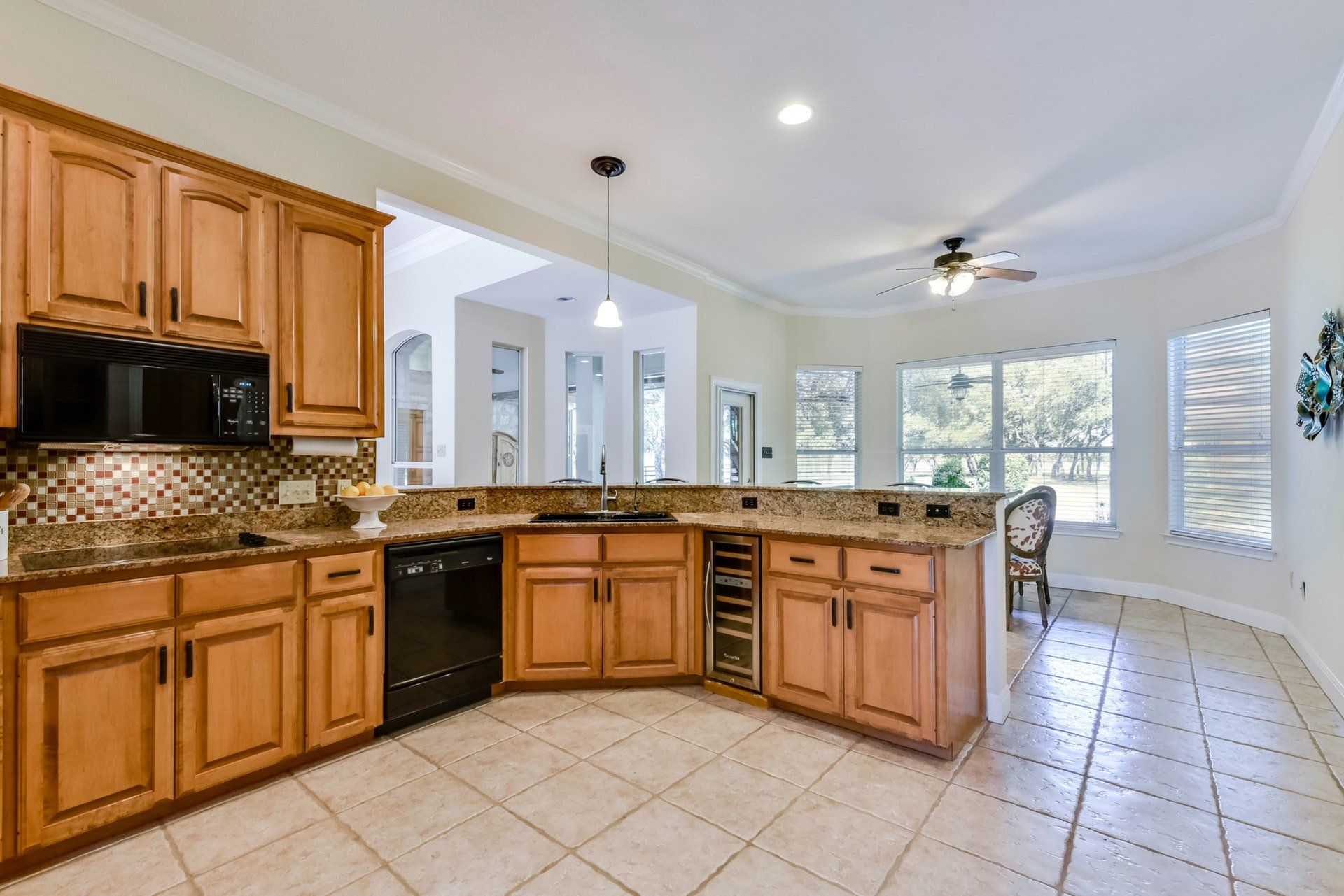 - Open kitchen with breakfast bar, granite counters, two ovens, electric range
