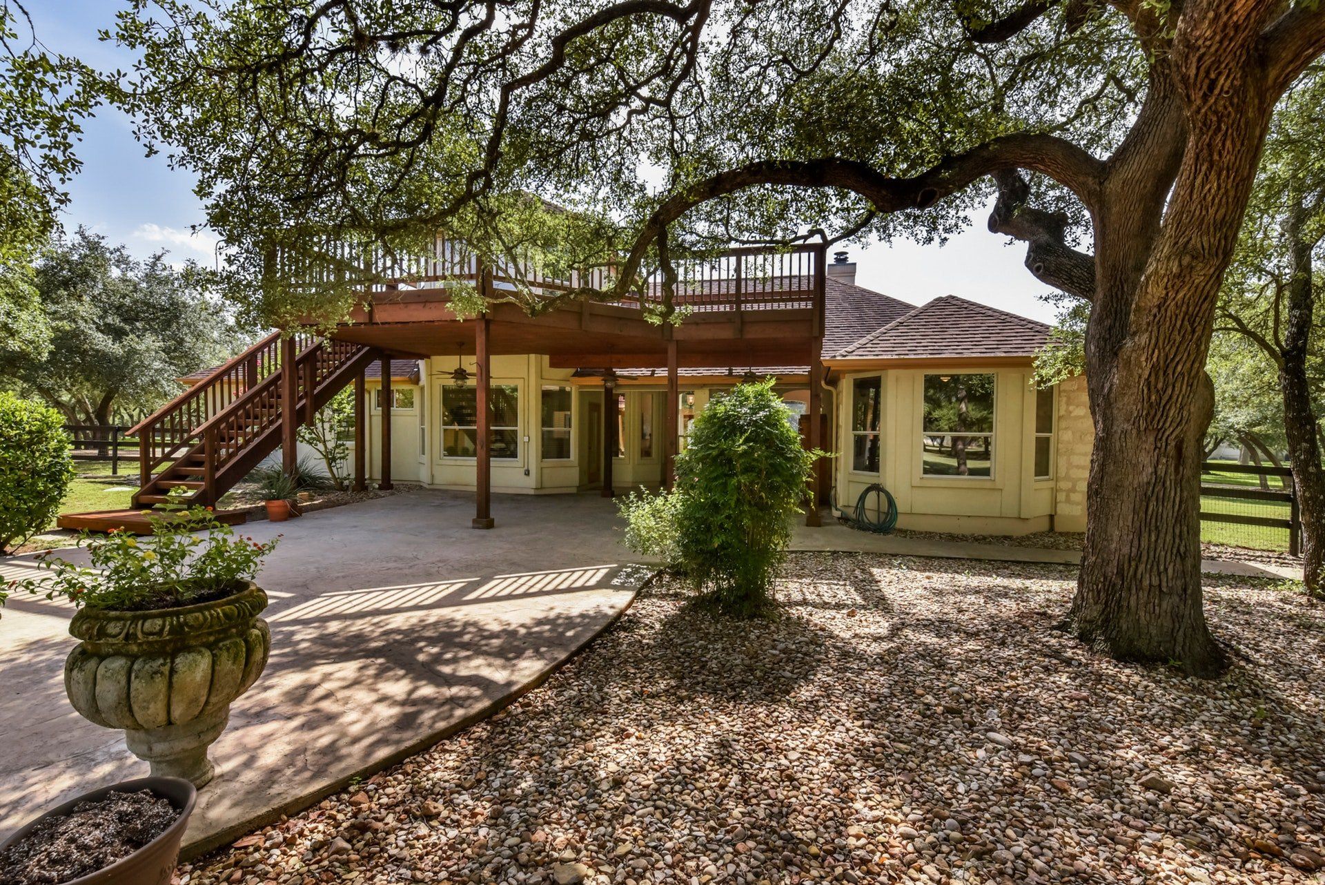 Great 2-story home with a fantastic floor plan; 4 bedrooms, 4 baths with three bedrooms down (including the master), plus an office suite/5th bedroom with a separate entry. Game room and a 4th bedroom are located upstairs. The gorgeous 2.16 acre estate lot, located in highly desired Woodland Estates, has 100+ oaks (per owner) and backs up to a pretty farm. It features an open kitchen with breakfast bar, granite countertops and double ovens. Low-maintenance ceramic tile & wide plank oak wood flooring are in the main traffic areas. Out back is a two-story, 1500 sq.ft (approximately) outdoor living space with an upper level deck and huge ground-level patio. There’s 40'x28'± architect-designed WORKSHOP with a one car garage bay. It’s climate controlled, has a sink, custom upper and lower cabinets, and a stairway to abundant attic storage with thermal barrier insulation. Built in 2012 it’s set among the oaks near the house. Multiple windows let in natural light so it could also serve as a studio or creative space. 3 minutes to Salt Lick & <10 mi to Seton SW with easy access to 290 and S Loop 1. Highly acclaimed Dripping Springs ISD. No MUD means lower property taxes!