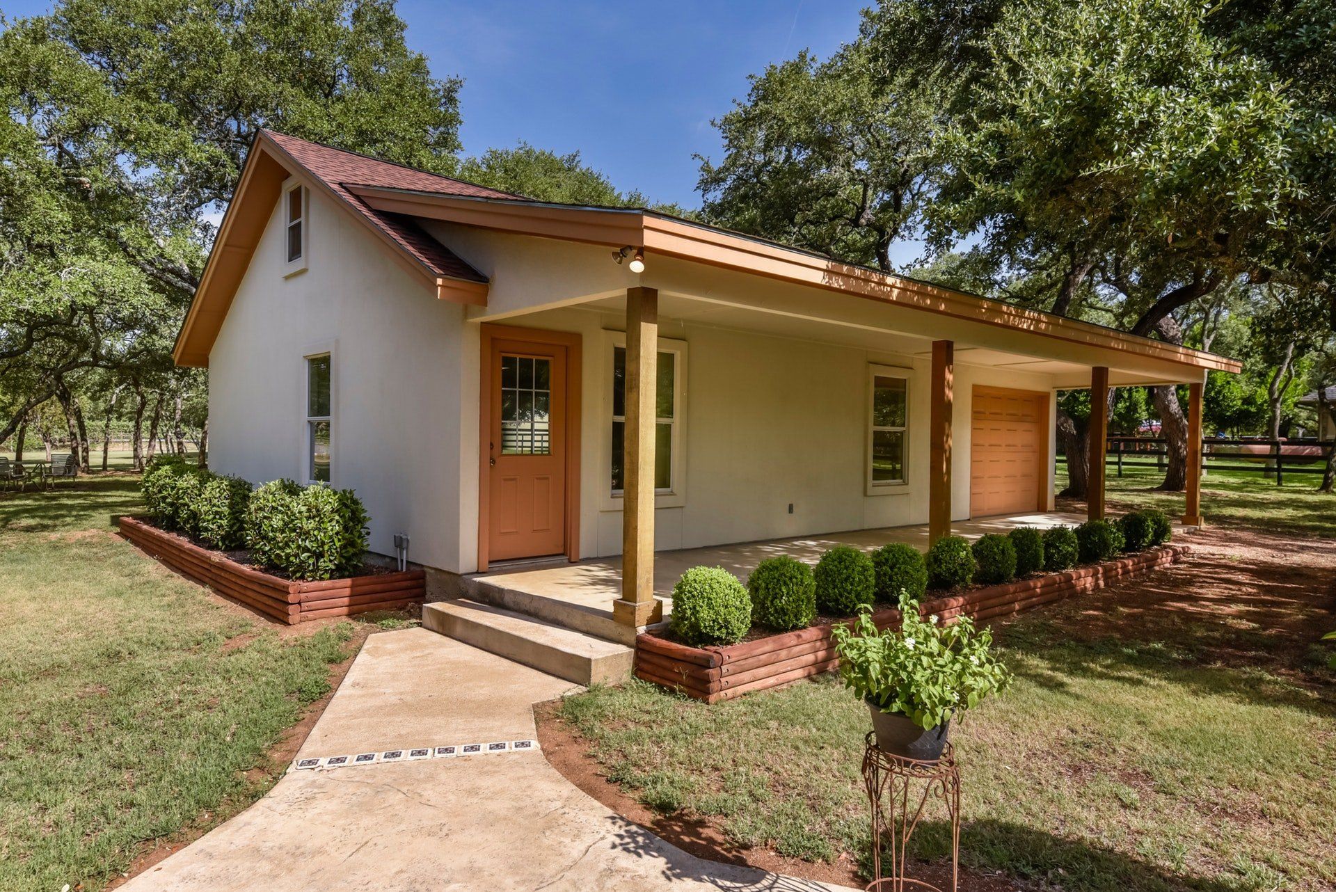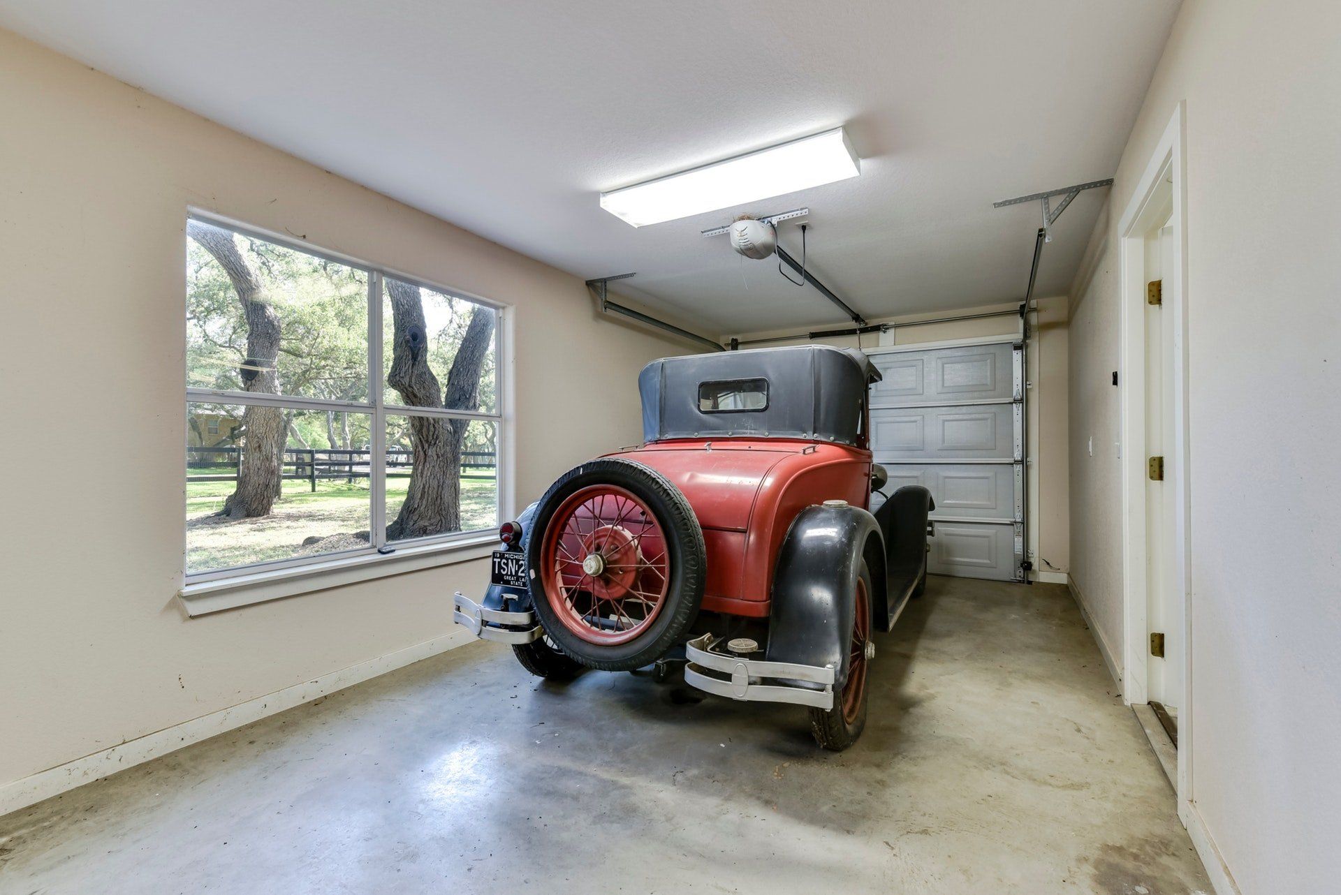 - A rear-entry two-car garage is attached to the main house. The workshop has an attached one-car garage
